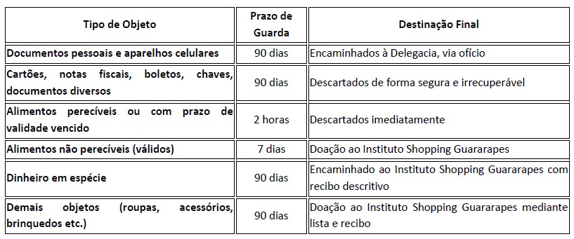 1.1. A presente Política de Achados e Perdidos tem por objetivo estabelecer diretrizes e procedimentos para o recebimento, registro, guarda, identificação, devolução e destinação final de objetos e valores perdidos ou encontrados nas dependências do Shopping Center Guararapes, assegurando transparência, rastreabilidade e segurança para os clientes e para administração.